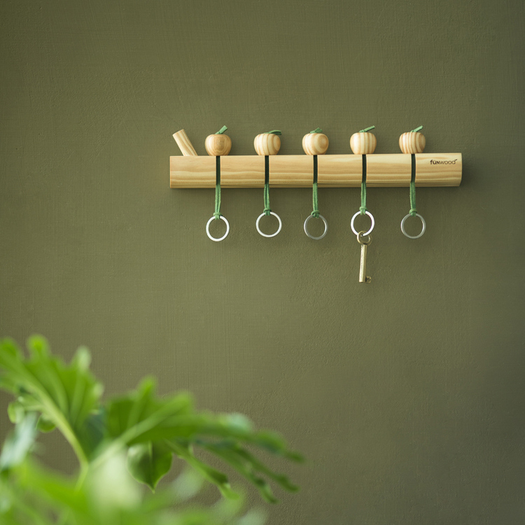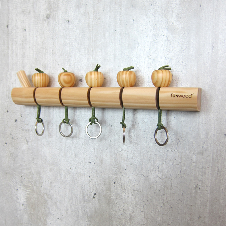 以蘋果樹為發想,運用蘋果的造型做為鑰匙圈,樹枝做為掛架,加上溫潤的木材天然紋路,及顏色的變化,精緻又療癒的小物,構成可愛玩味的景象,讓人充滿無限的想像空間。