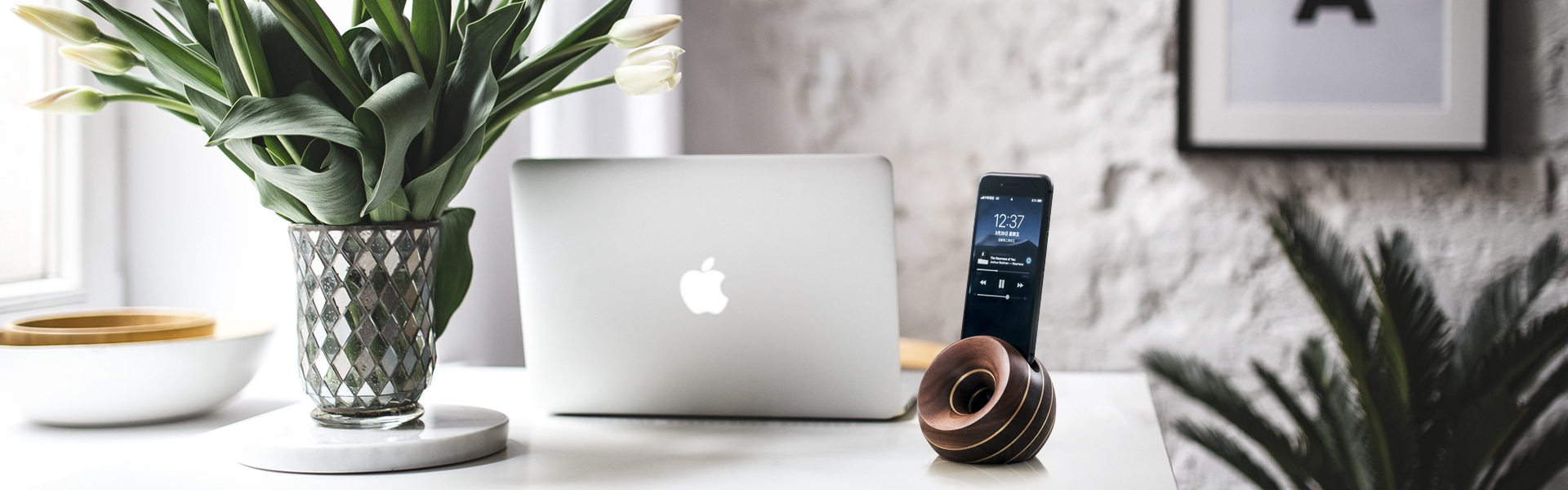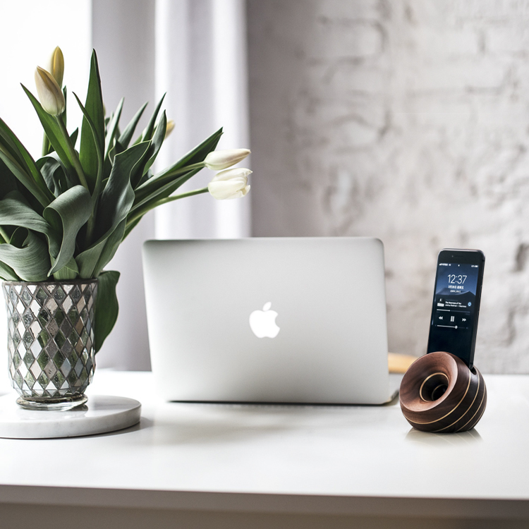 在外觀上 除了運用圓球優雅的造型,亦在視覺效果上利用木材與銅片的間距,構成音波的設計語言 , 使產品本身更能表現出擴音器的意境。